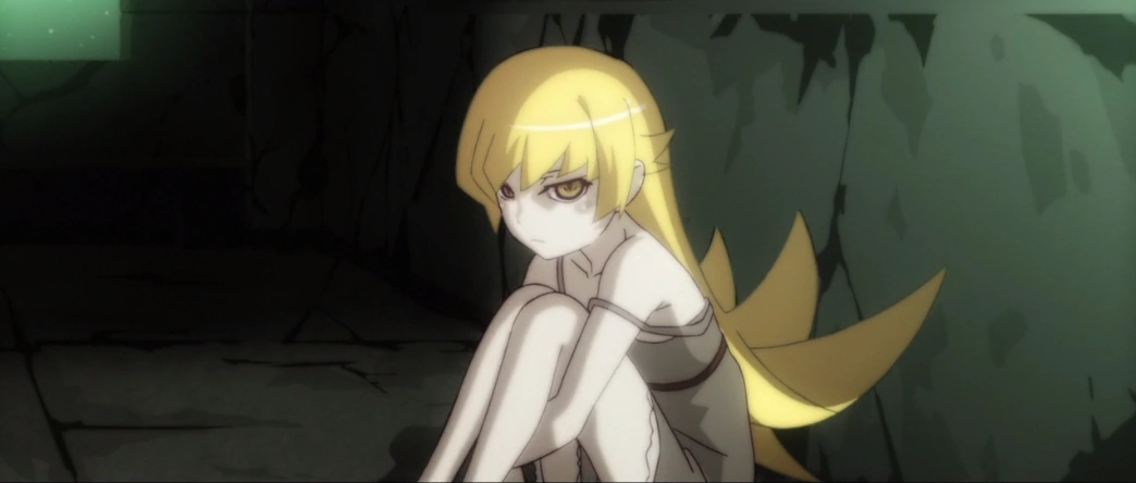 After losing most of her vampire powers, Shinobu falls into a long period of stupor. She is frequently seen in Oshino's place with her hands tucking her knees in, her face always in an emotionless state. She often spends most of the day in one spot, doing mostly nothing with a bitter expression. Shinobu also does not talk to anyone, but she is familiar with Koyomi Araragi and Meme Oshino, and would follow requests from either of them.